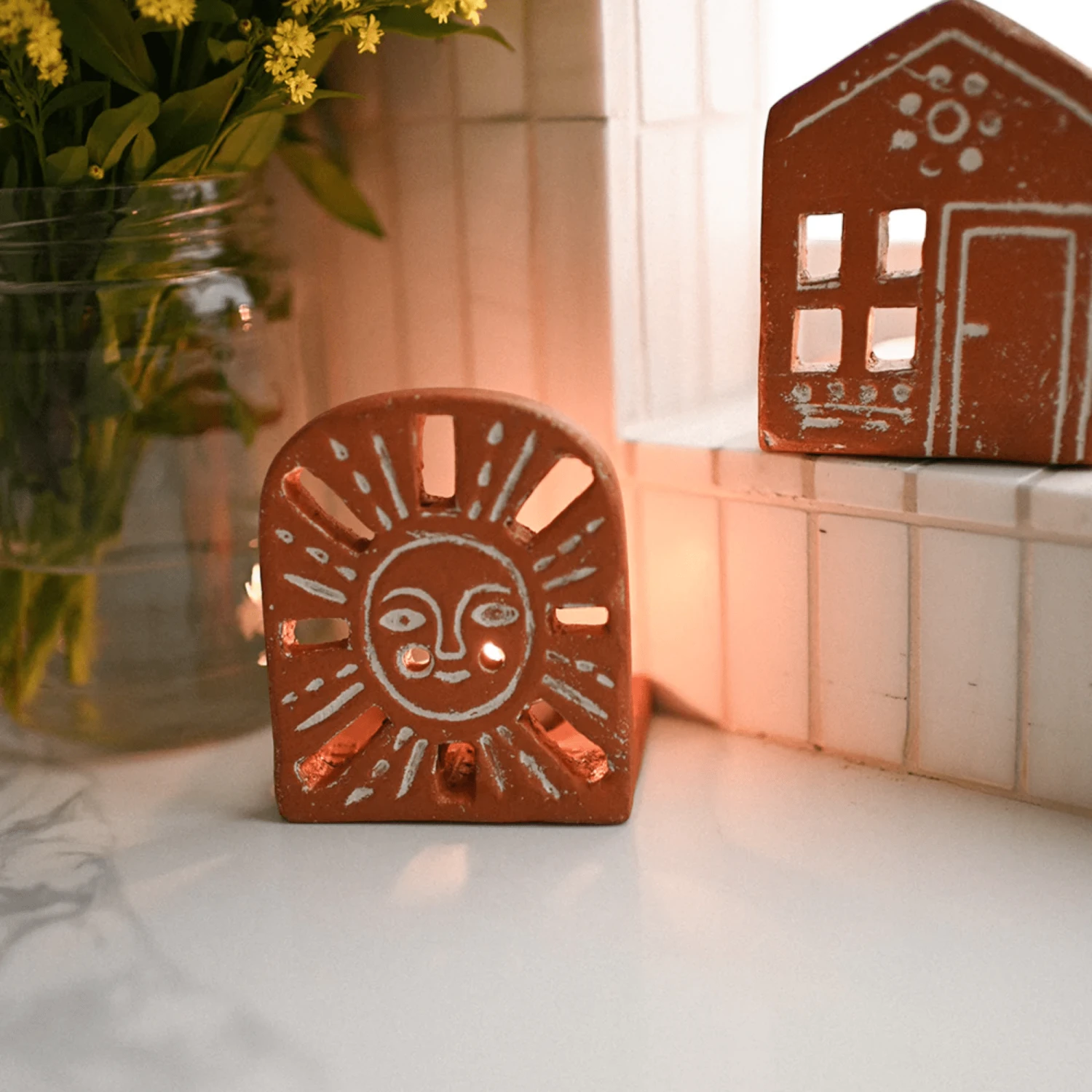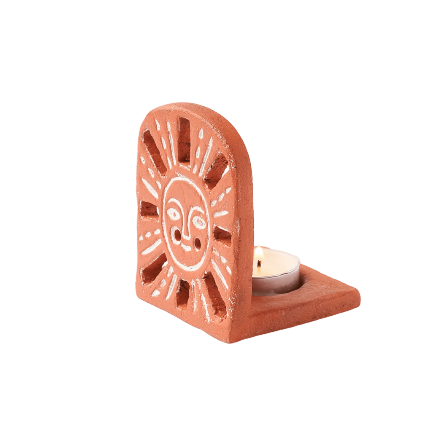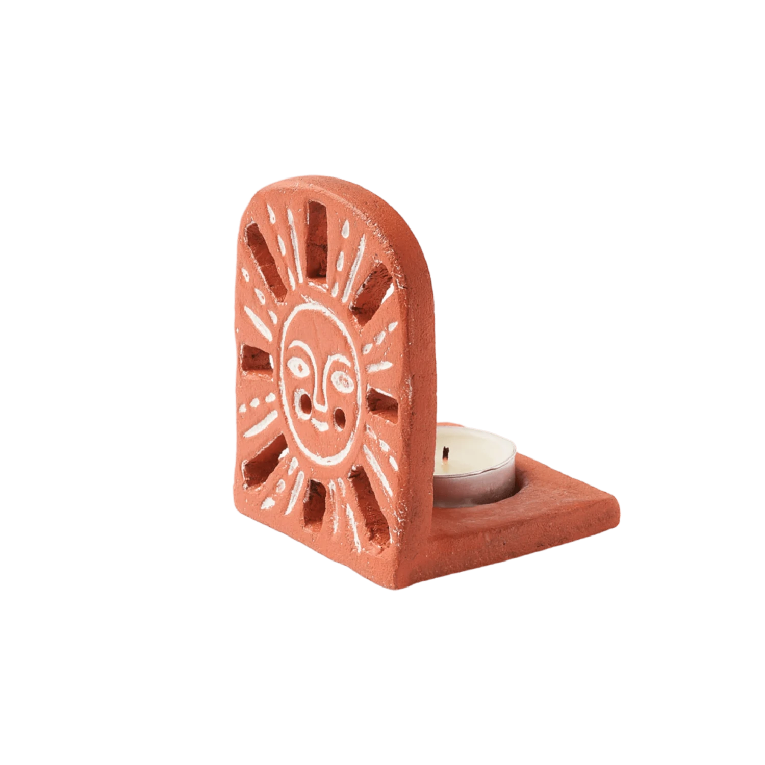 This Aayu Sunrise Terracotta Tealight Candle Holder from the Aayu Collection boasts a unique and attractive design that features silhouetted holes in the terracotta clay. The perfect gift for any special occasion, this candle holder will add a warm and cheerful ambiance to any space. Get well soon wishes and birthday surprises alike will be even more meaningful when presented in this delightful tealight holder.