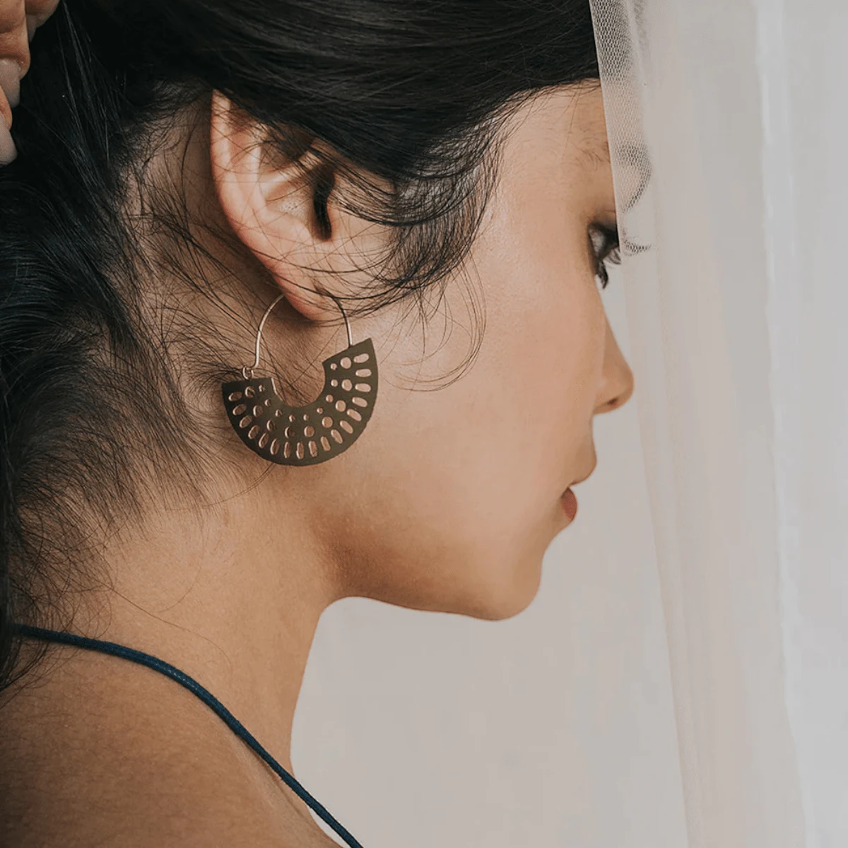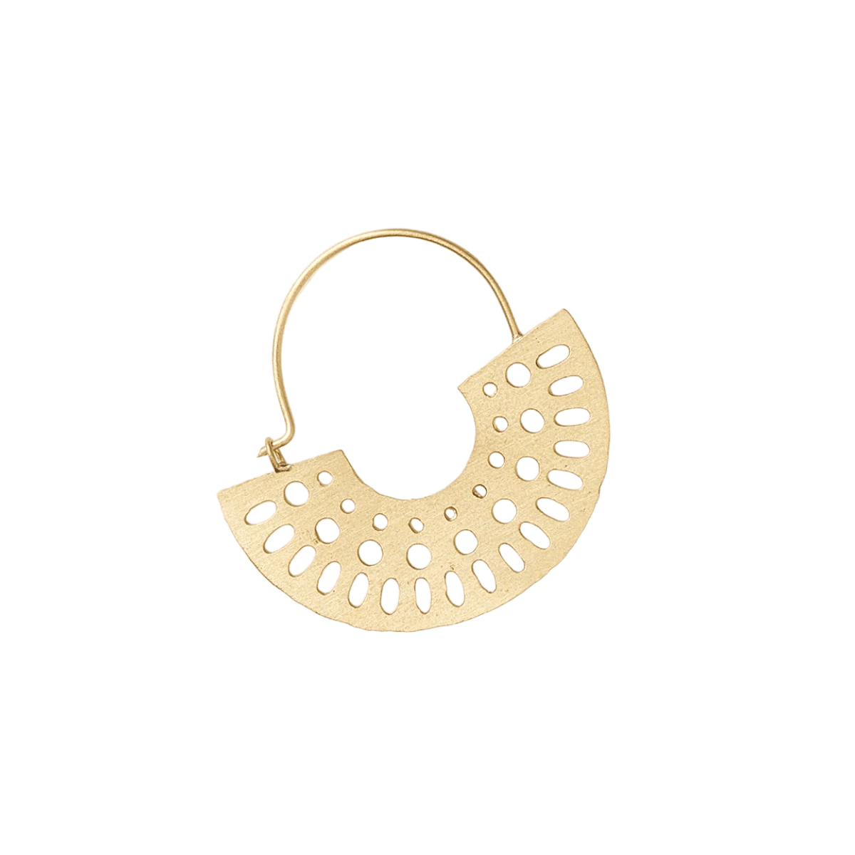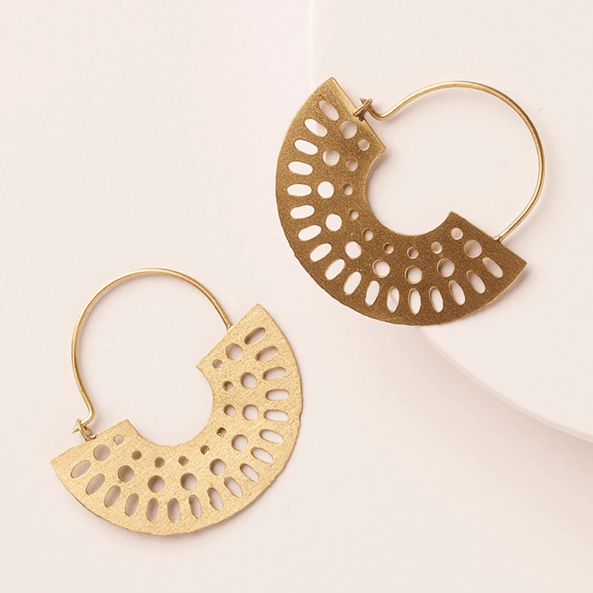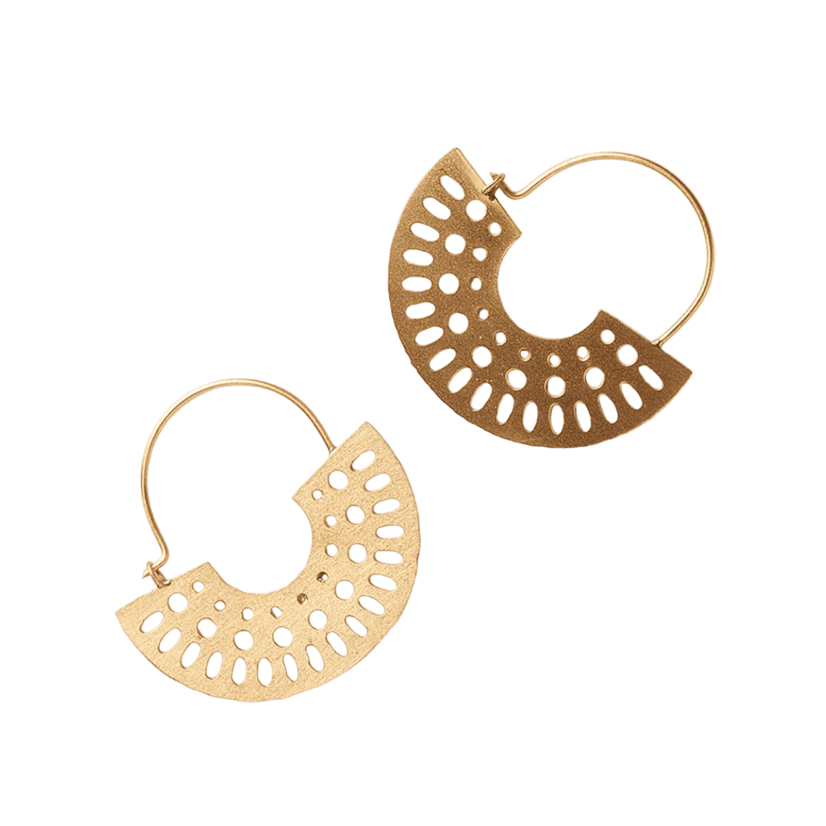 Our fierce Abhaya Collection features a signature, radial cutout design, in brass with a shiny gold tone finish. Traditional jewelry making techniques of Old Delhi are thoughtfully applied in these bold filigree motifs for a uniquely rich quality. These handcrafted, lightweight hoop earrings feature gold finish disc charms with an eye-catching, radial cutout design and clean wire setting.