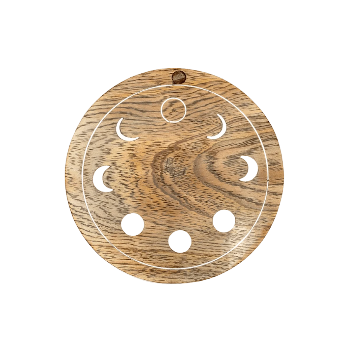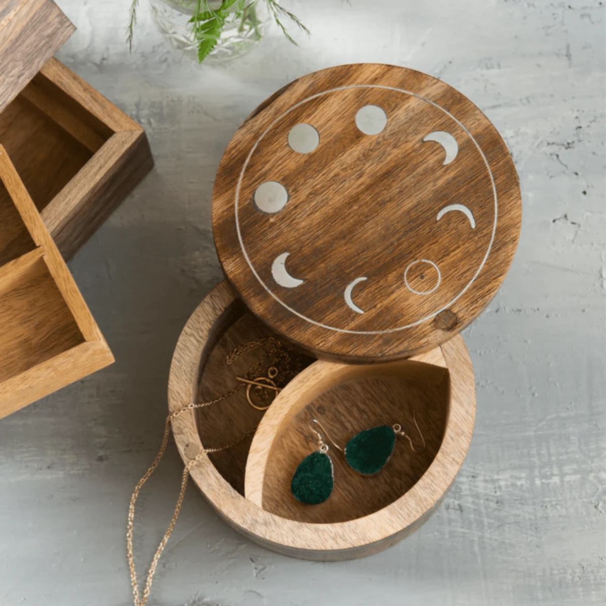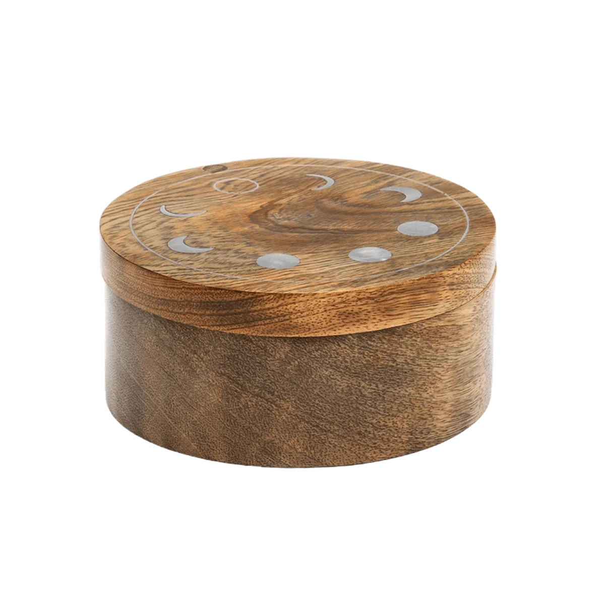 This round-shaped Anayra keepsake box includes two compartments for storing jewelry and trinkets securely and tidily. Crafted with sustainably sourced mango wood, the Anayra Collection includes a metallic moon phase design, inlaid by expert artisans in India and filled with a silver-finished brass. This collection of lunar-inspired gifts adds uniqueness to any home.