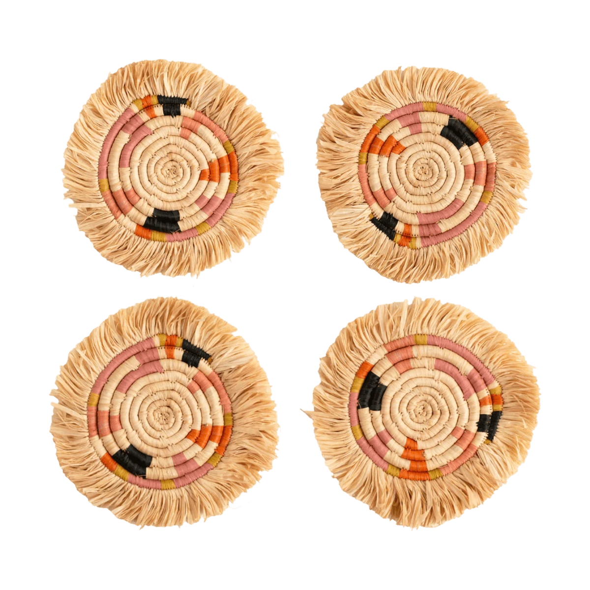 Intricately crafted with timeless tradition, this carefully dyed sisal fiber and sweet grass fringe coaster set makes a bold and exciting statement piece.