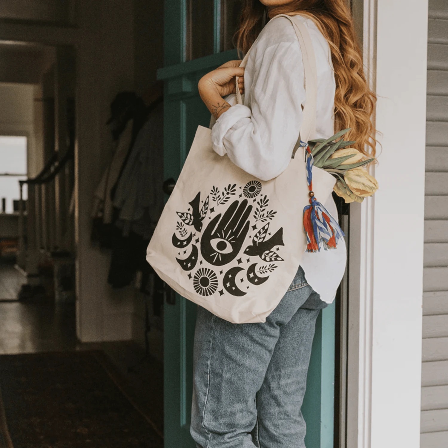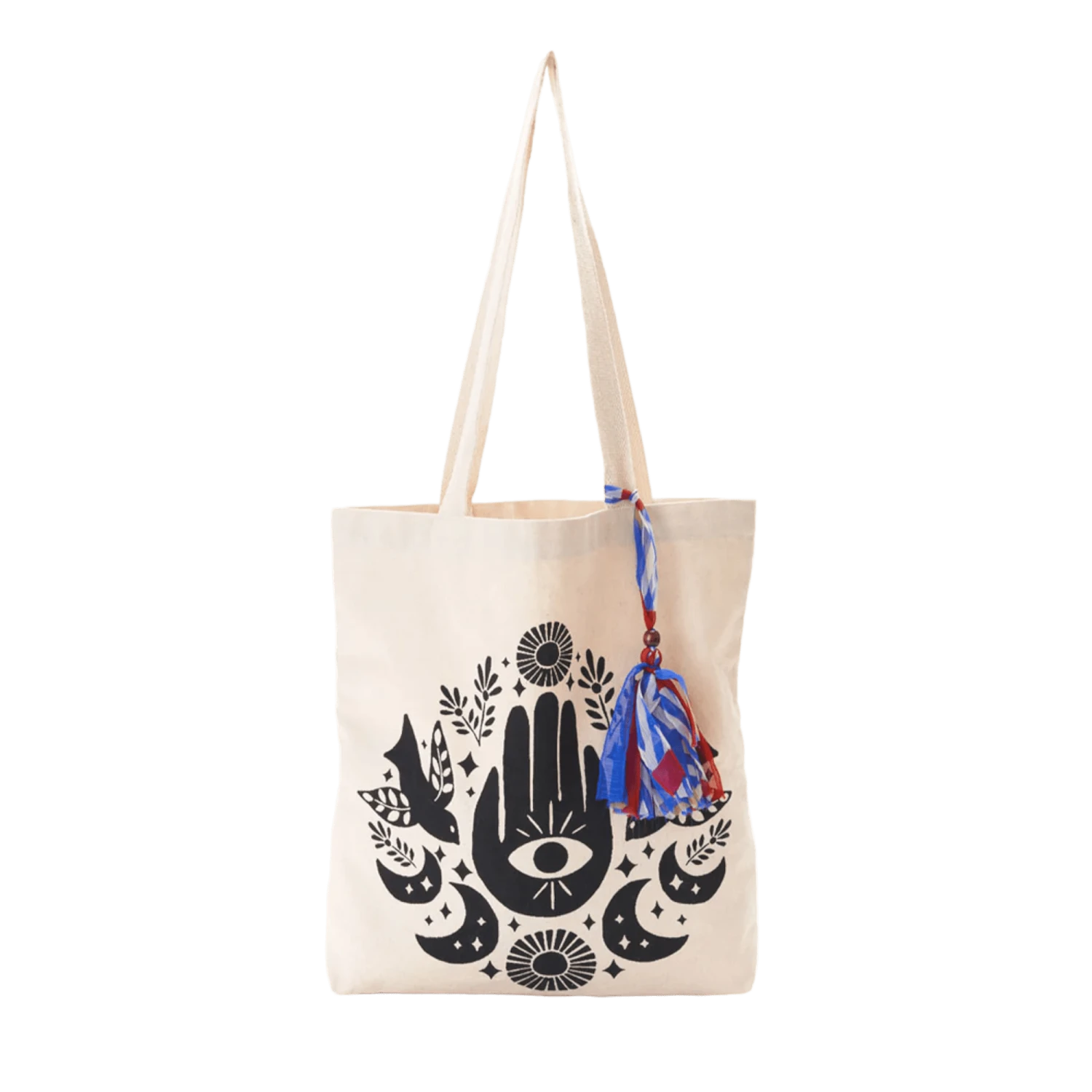This one-of-a-kind, handcrafted cotton tote bag adds convenience and style to everyday errands. Featuring an alluring hamsa hand and crescent moon phase design, the fair trade bag offers a sustainable way to reduce waste and make a statement. Its generously sized canvas can carry groceries, books, crafts and more, making it an ideal companion for any activity. Each bag is designed in Austin, Texas and handcrafted with love in India.