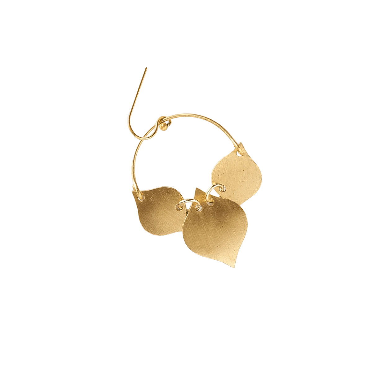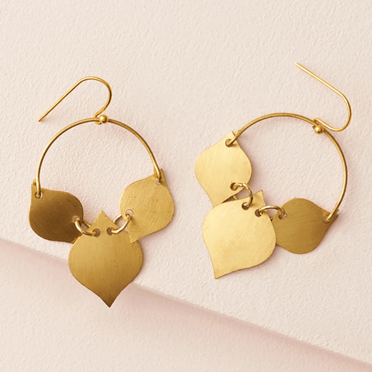 Our flattering Chameli Collection features versatile, modern floral motifs in a bouquet of gold and teal patina finish designs on brass. Traditional jewelry making techniques of Old Delhi are thoughtfully applied in this simple, elegant design for a uniquely rich quality. These handcrafted hoop earrings feature lightweight, brass leaf charms in a refined, linked design with gold tone finish.