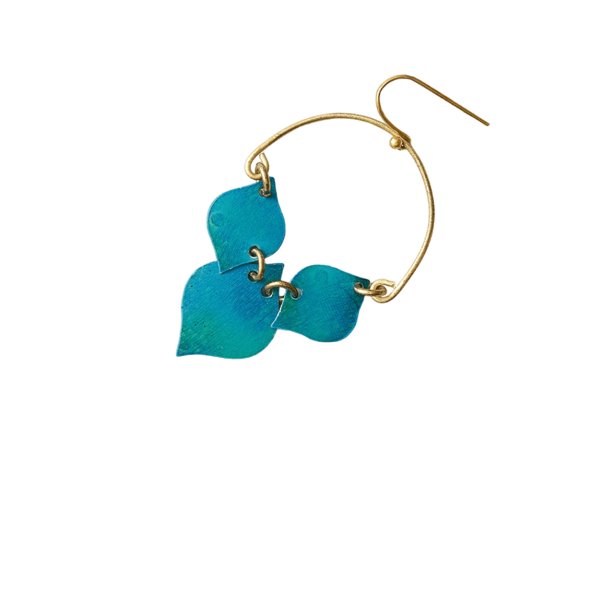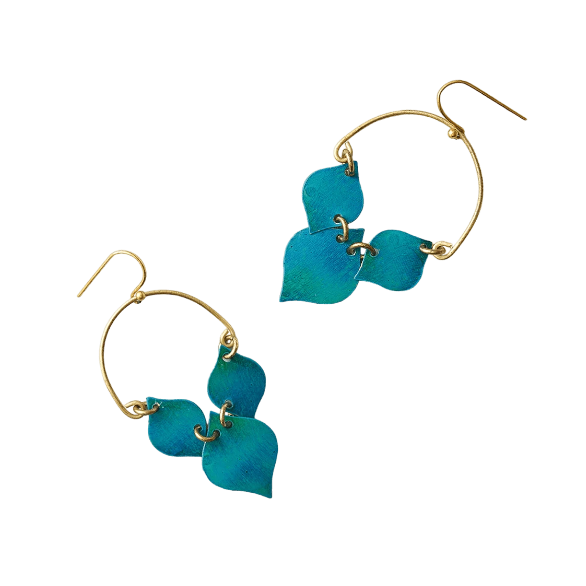 Our flattering Chameli Collection features versatile, modern floral motifs in a bouquet of gold and teal patina finish designs on brass. Traditional jewelry making techniques of Old Delhi are thoughtfully applied in this simple, elegant design for a uniquely rich quality. These handcrafted hoop earrings feature lightweight, brass leaf charms in a refined, linked design with teal patina finish.