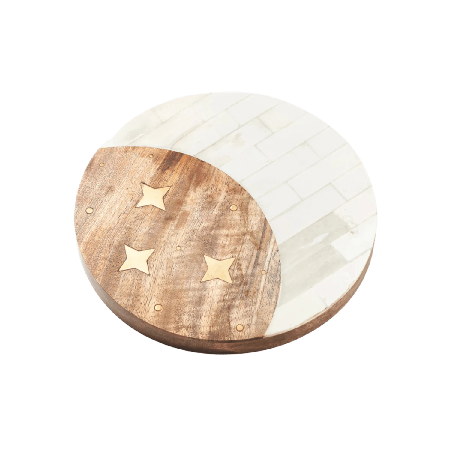 Introducing the Edhit Moon & Stars Cheese Board: expertly crafted from sustainably harvested mango wood in India, this round board features a moon hand carved from ethically sourced bone, and stars handcrafted from gold finish brass, creating a beautiful constellation design. Perfect for entertaining, it is a unique example of traditional Indian wood craft, passed on through generations.