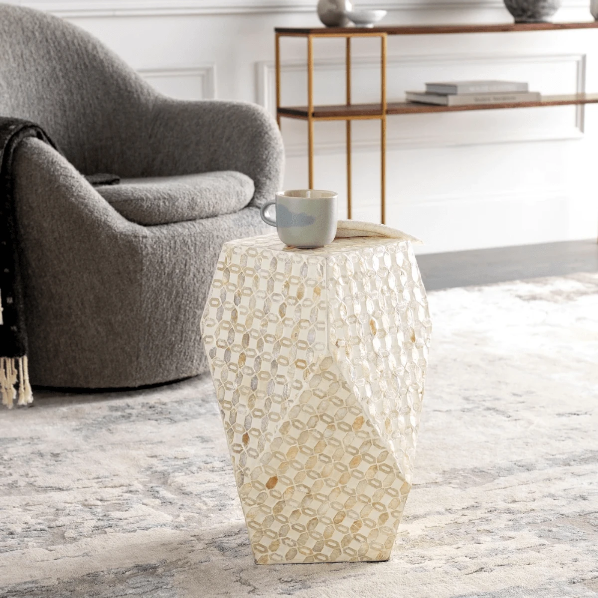 Gorgeous and global-inspired, the Farida End Table is sure to make a statement in any room! Handcrafted with elegant shell and manufactured wood, this piece will bring your home a sophisticated and unique flair. Perfect for adding a touch of eclectic charm, it’s sure to be the envy of friends and family!