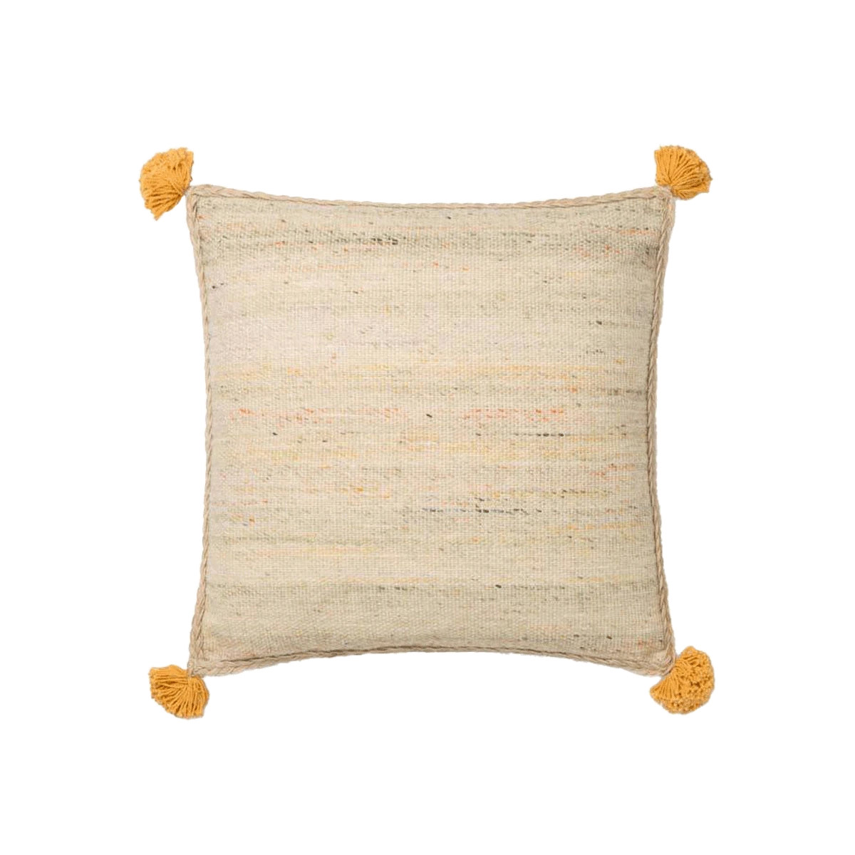 Designed by Justina Blakeney® for Loloi Rugs, our gold Arena Pillow featured a textured neutral base with the perfect pop of yellow gold pom poms! This pillow is the perfect neutral that can be mixed in with your fun + funky pillows.