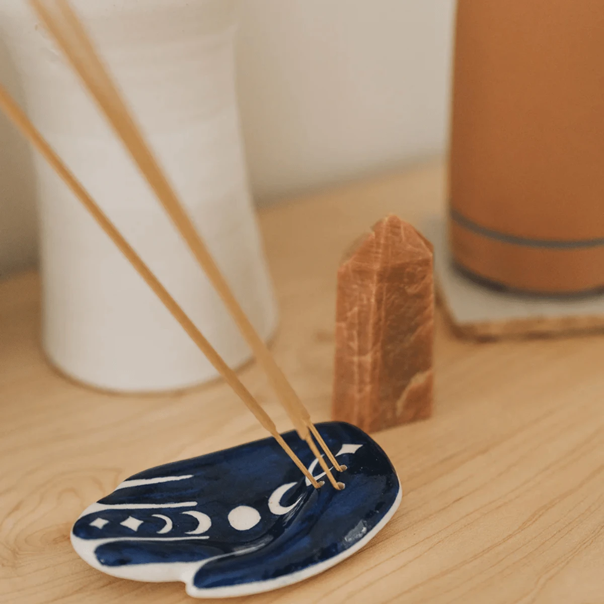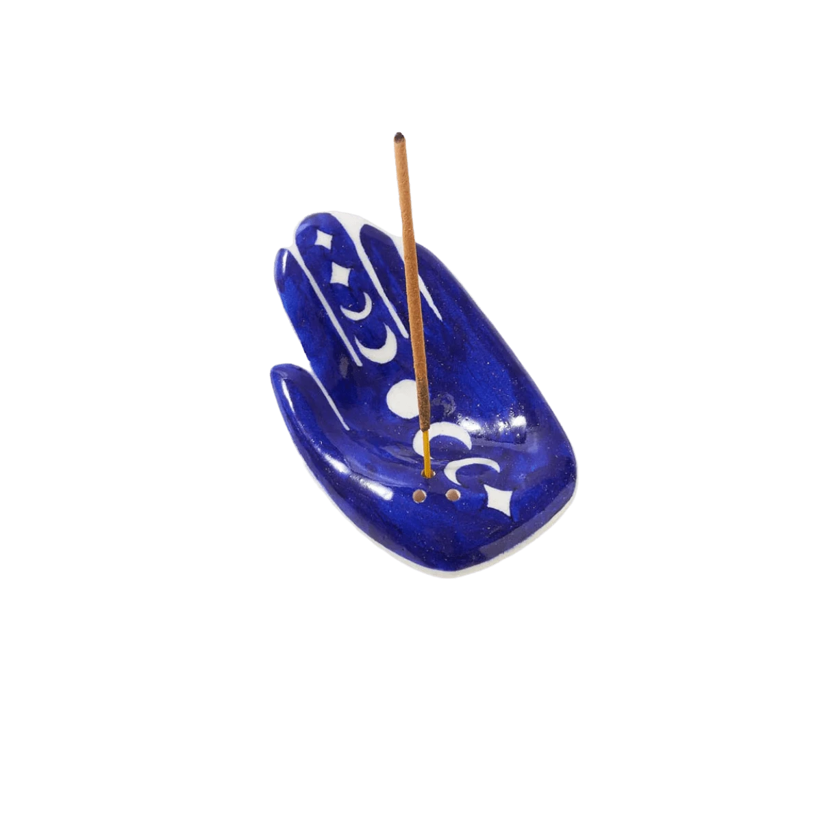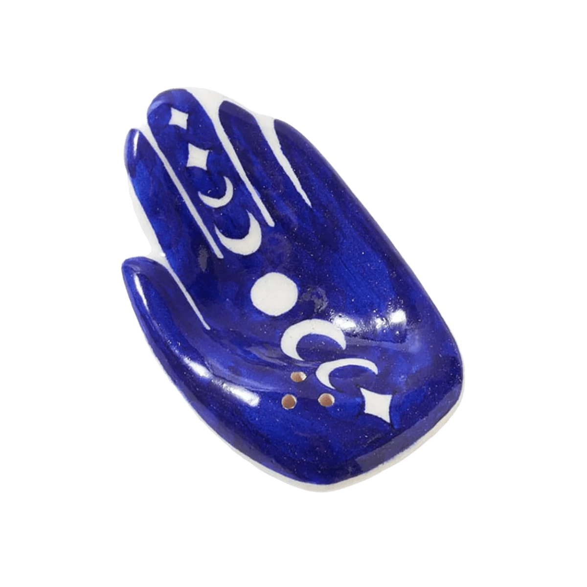 Enhance your space with this alluring, ceramic incense holder dish handcrafted by master artisans from Blue Jaipur Pottery. The finest of Rajasthani pottery, this ethically handcrafted incense holder dish features a Hamsa hand and lunar moon phase design brought to life with non-toxic paints and finished with lead-free glaze. This unique dish has three holes in the lower palm area where incense sticks can be inserted. Bring tranquility, healing, and optimism to your space with this intentionally designed piece or gift to a loved one in need of the same.