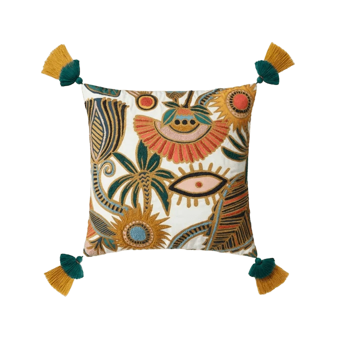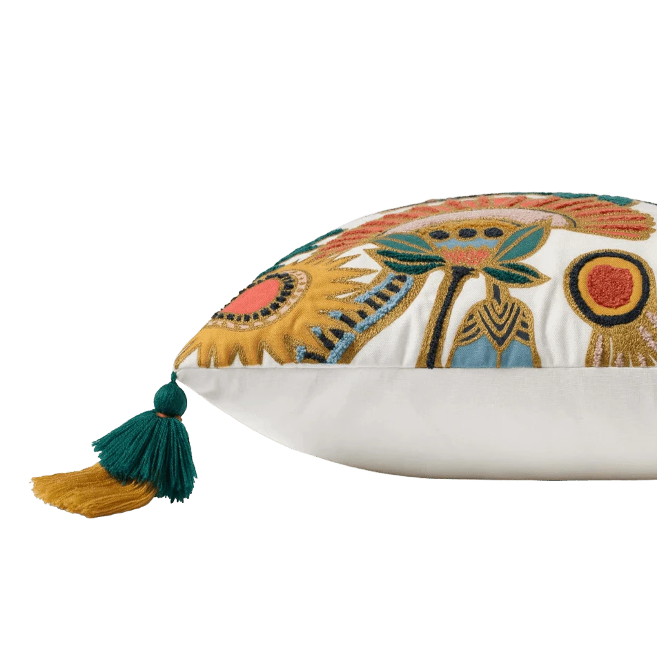 The fresh design is filled with leafy greens, light blues, and pops of marigold & bright coral against the neutral ivory ground. The corner tassels add to the unique, fun feel.