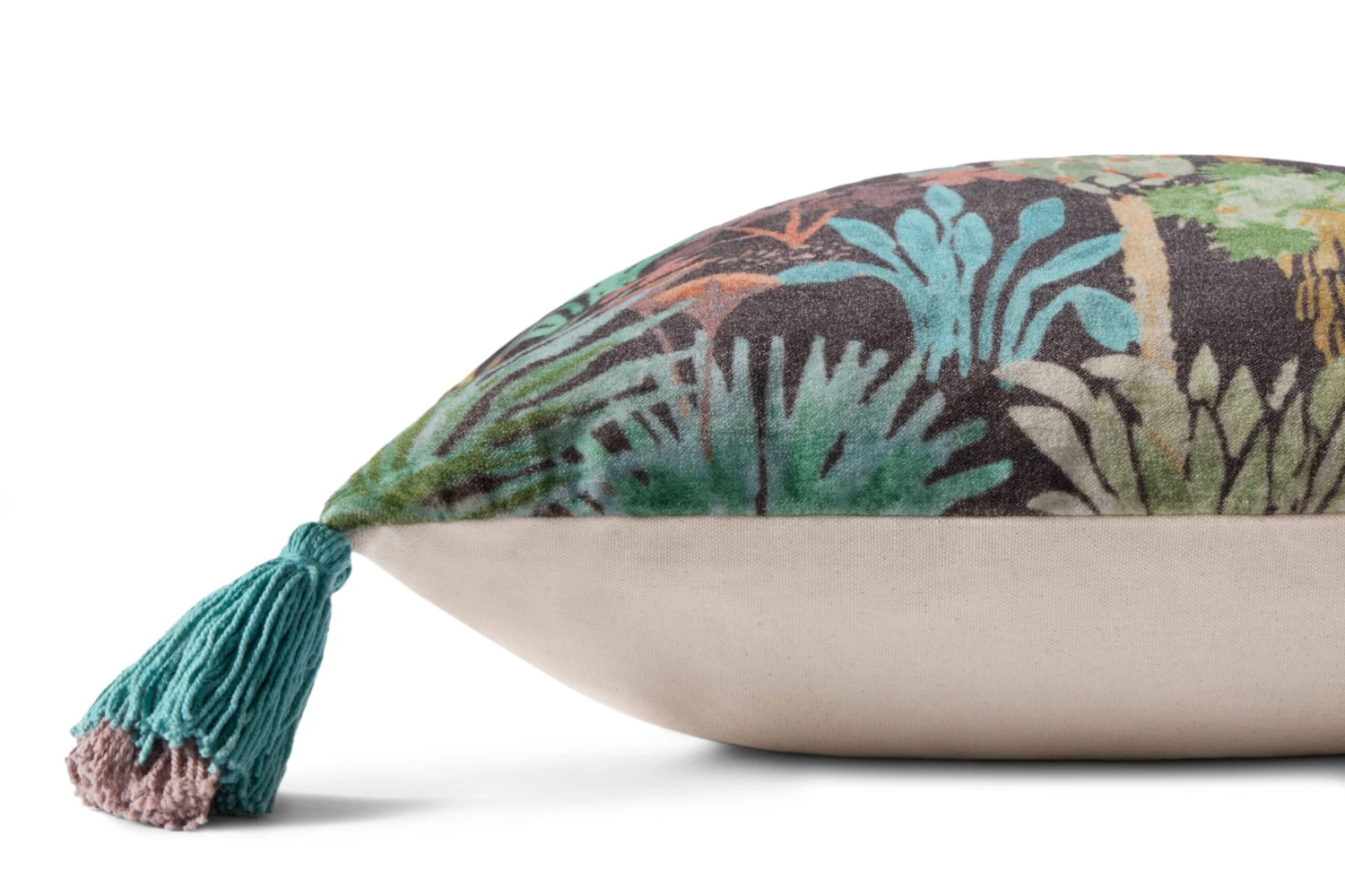 Our bestselling Phoenix pattern is featured on this vibrant pillow with turquoise and pink tassels at the corners.