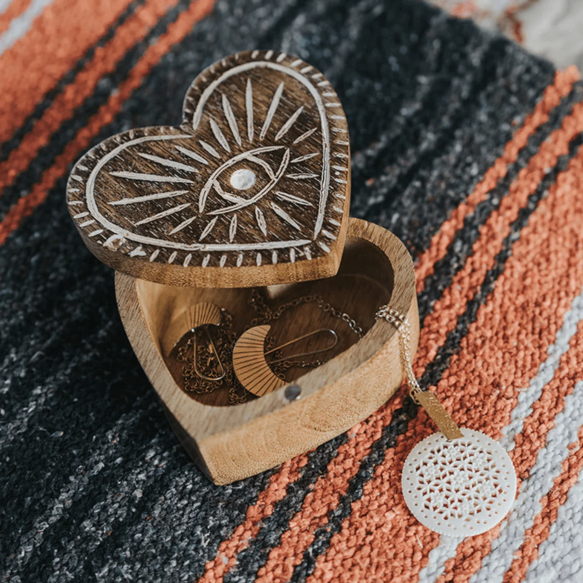 This heart shaped box with lid is handcrafted with sustainably harvested mango wood. Master artisans in north central India begin with solid blocks of ethically sourced wood and use hand tools to skillfully carve the blocks into functional works of art. This hand carved wooden box features an evil eye carving on the lid. The swivel lid pivots to reveal the open, heart shaped, inner compartment. The alluring evil eye art and white rub finish give this box an heirloom quality of wooden treasures collected in the bustling spice markets of Delhi or Calcutta. This piece can be used as a handcrafted jewelry box, wooden keepsake box, memory box, or unique gift box. The evil eye design is a quasi-universal symbol of protection. The evil eye is a look or stare believed to bring bad luck for the person at whom it is directed. Wearing an evil eye talisman is said to ward off evil forces. Displaying this talisman over the entrance of a home is thought to keep it protected. Add this hand carved wooden box to your boho home decor, office decor, or dorm decor to protect your energy and space, or give this gift with meaning to a friend or loved one. This heart box will make a meaningful housewarming gift or gift for a graduate. It will make an excellent box for crystals, rare coins, jewelry, or a sewing kit. A wooden box is a reusable and sustainable gift wrapping idea for small gifts, jewelry gifts, monetary gifts, or honey pot gifts. This mango wood box can also be used to transform a traditional gift card box into a keepsake.