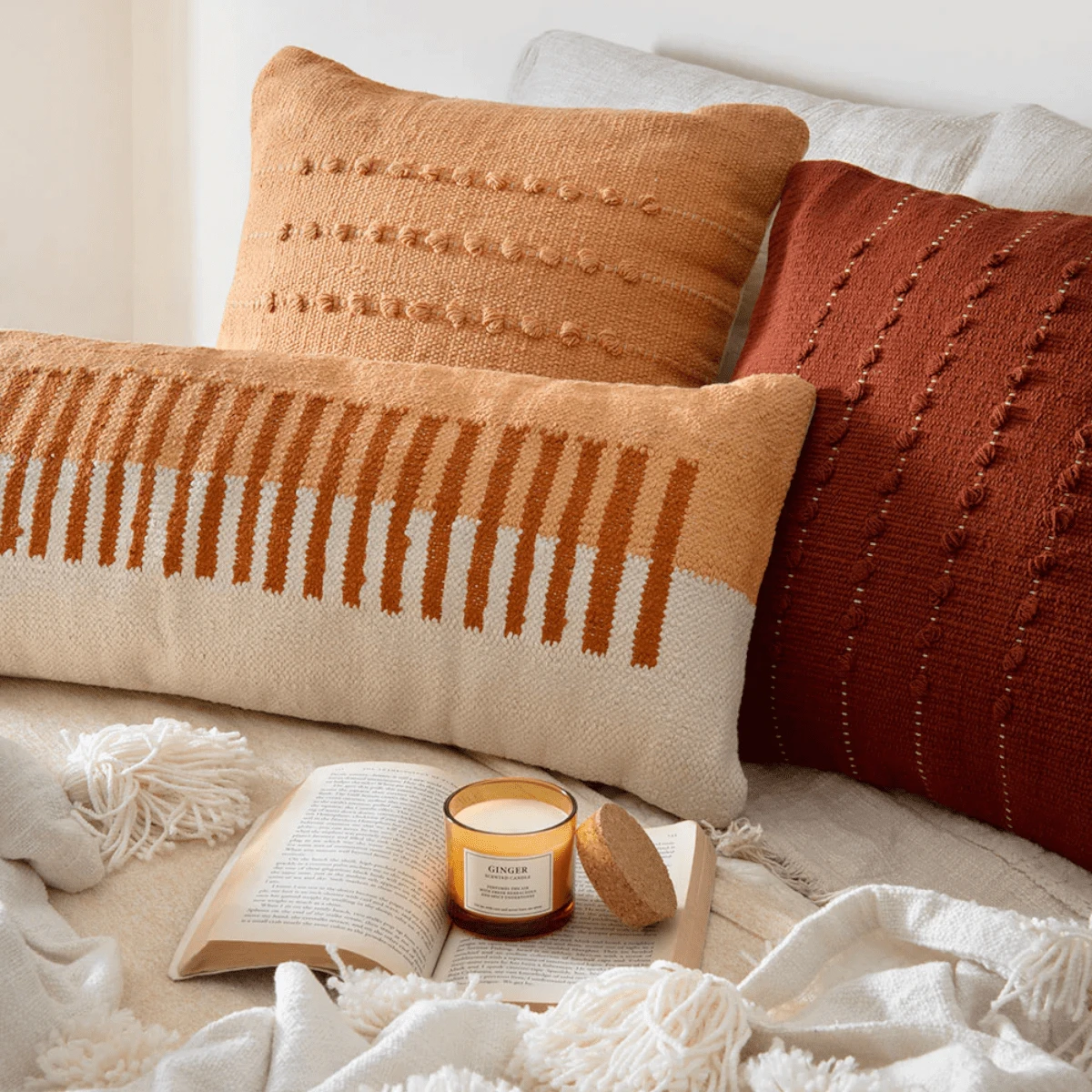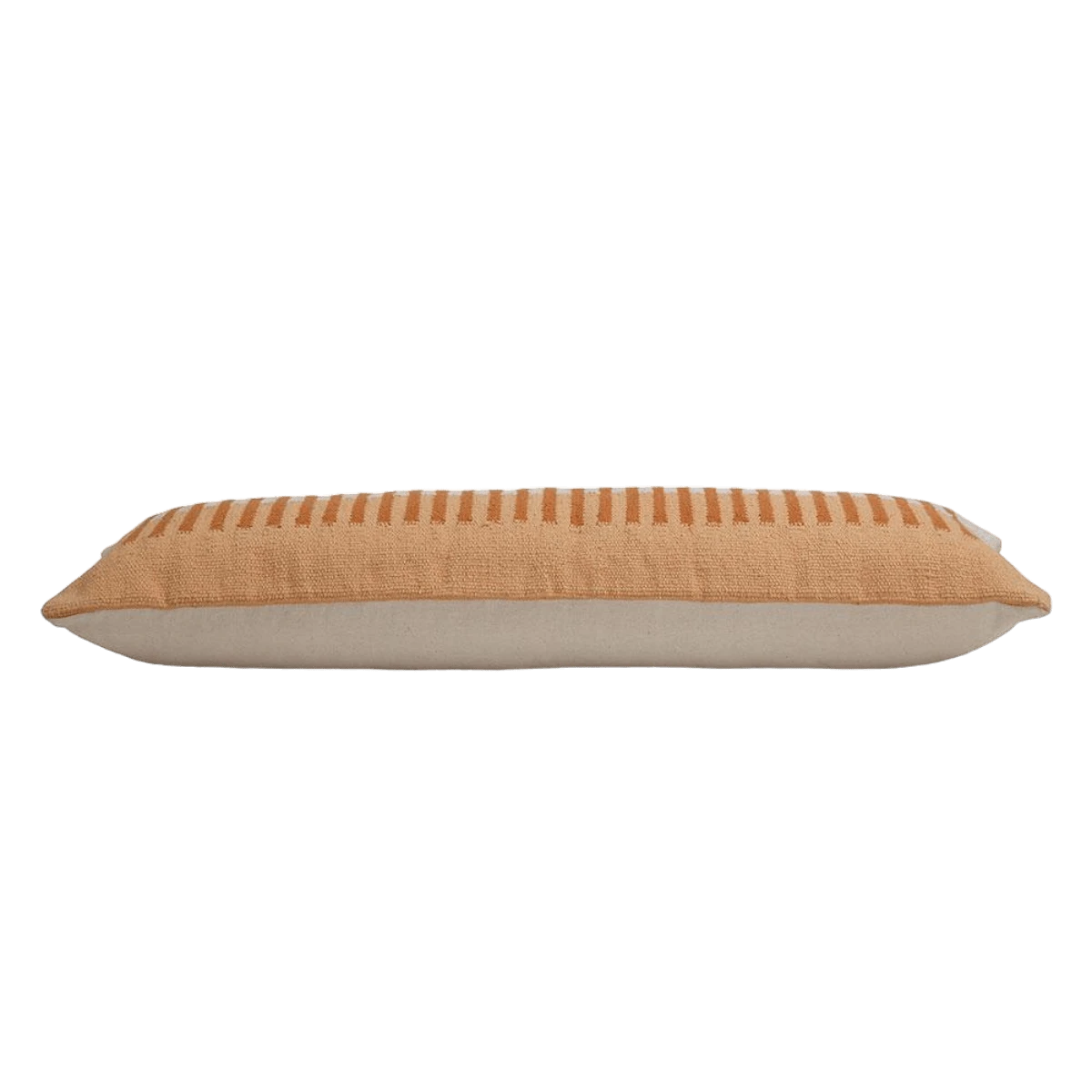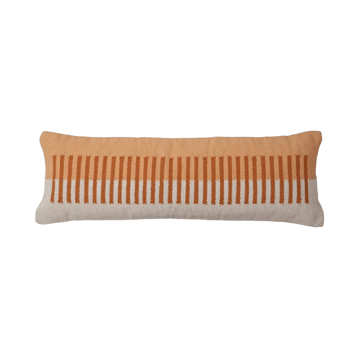 This pillow takes its inspiration from the colors of the sunset. Handmade by master weavers on pit looms, artisans use traditional Indian weaving techniques.