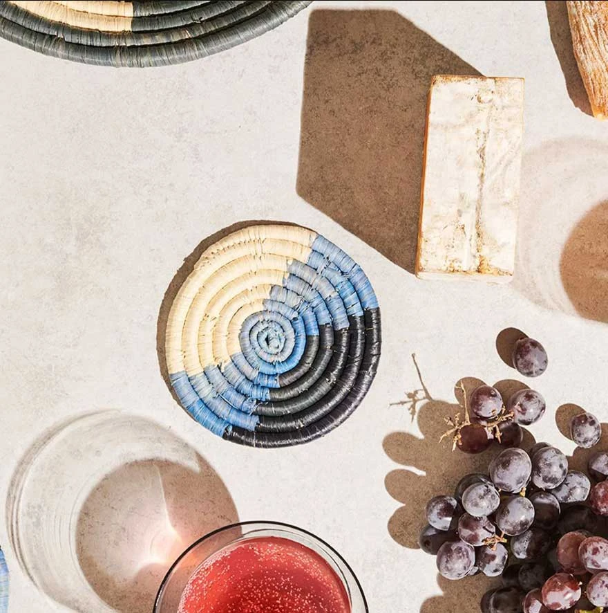 Intricately crafted with timeless tradition, this carefully dyed sisal fiber and sweet grass fringe coaster set makes a bold and exciting statement piece.